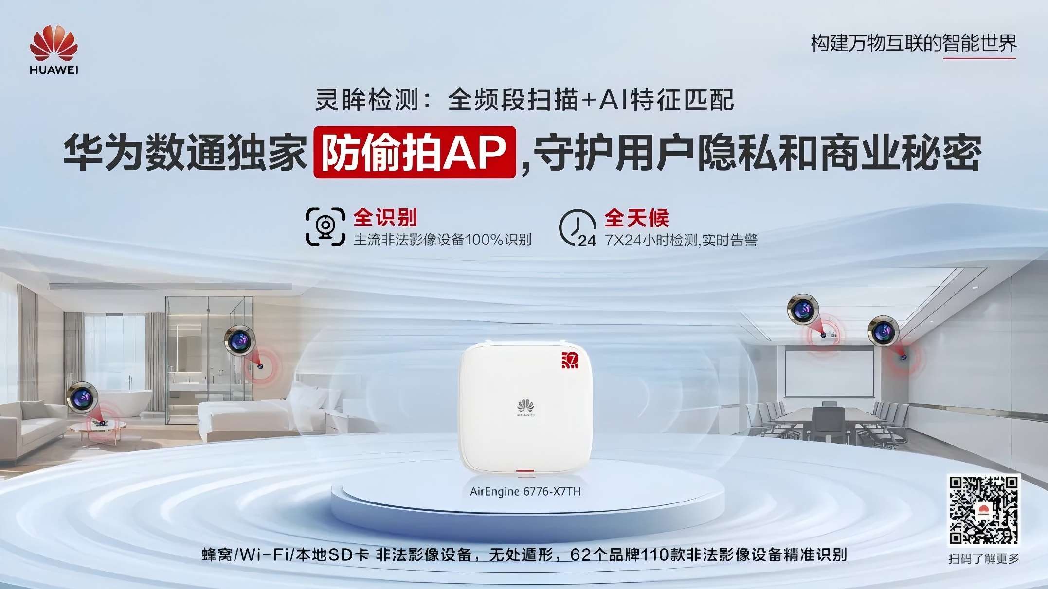 蓝讯科技(华为坤灵授权代理商)将AI防偷拍技术与酒店场景融合,打造全流程解决方案,其防偷拍AP设备以"防飞房AI引擎"实现99%精准识别(覆盖60+品牌100+款摄像头),误判率低...